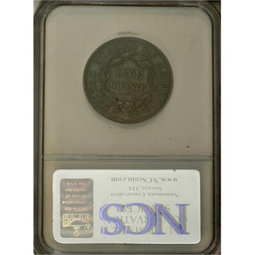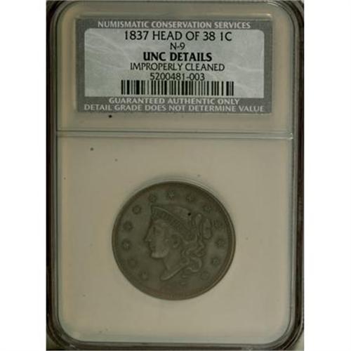 <B>1837 1C Head of 1838 Brown--Improperly Cleaned--NCS. UNC Details.</B></I> N-9. NGC Census: (1/330). PCGS Population (4/142). Mintage: 5,558,300. Numismedia Wsl. Price for NGC/PCGS coin in MS60: $200. (#1729)<BR><BR><B>Coin Engraver:</B> Robert Scot or John Reich<BR><BR><b>Shipping:</b> Coins & Currency (<a target="_blank" href="http://www.heritageauctions.com/common/shipping.php">view shipping information</a>)