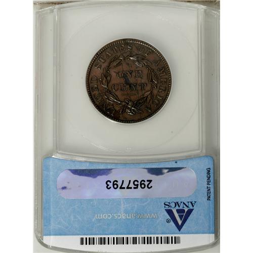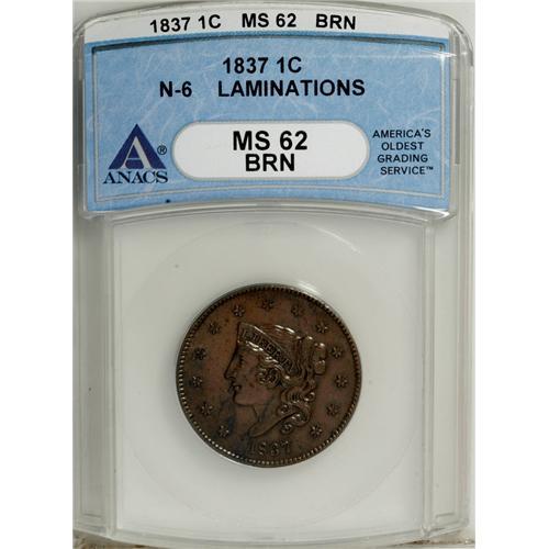 <B>1837 1C Medium Letters--Laminations-- MS62 Brown ANACS.</B></I> N-6.<BR><BR><b>Shipping:</b> Coins & Currency (<a target="_blank" href="http://www.heritageauctions.com/common/shipping.php">view shipping information</a>)