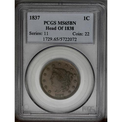 1837 1C Head of 1838 MS65 Brown PCGS. N-10, R.1. This