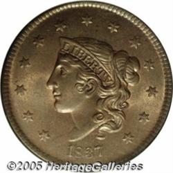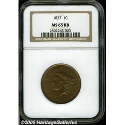 <B>1837 1C Head of 1838 MS65 Red and Brown NGC.</B></I> N-13, R.2. A lovely example of this variety which shows decent color and very attractive surfaces. The strike is sharp for this later die state, and we note minor flow lines and the usual light crack through the tops of the entire legend. Scarce in any Gem grade, this coin should please most collectors. Population: 8 in 65, 10 finer (2/05).