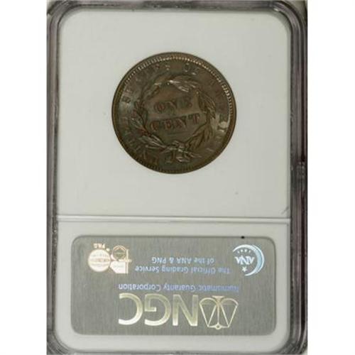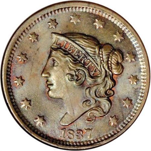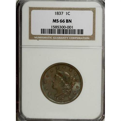 <B>1837 1C Head of 1838 MS66 Brown NGC.</B></I> N-10, R.1. Beautifully toned sky-blue, lime, and chocolate-brown. Well struck aside from the right-side stars. Booming luster sweeps surfaces that are unperturbed except for a few unimportant field grazes and couple of hair-thin, mint-made, vertical obverse laminations. EAC 62.<BR><BR><B>Coin Engraver:</B> Robert Scot or John Reich<BR><BR><b>Shipping:</b> Coins & Currency (<a target="_blank" href="http://www.heritageauctions.com/common/shipping.php">view shipping information</a>)