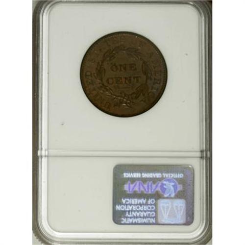 <B>1837 1C Plain Cords, Medium Letters MS62 Brown NGC.</B></I> N-1, R.3. This pleasing example shimmers with satin luster. Mostly golden-brown with occasional glimpses of dusky rose or steel-gray. EAC 45.<BR><BR><B>Coin Engraver:</B> Robert Scot or John Reich<BR><BR><b>Shipping:</b> Coins & Currency (<a target="_blank" href="http://www.heritageauctions.com/common/shipping.php">view shipping information</a>)