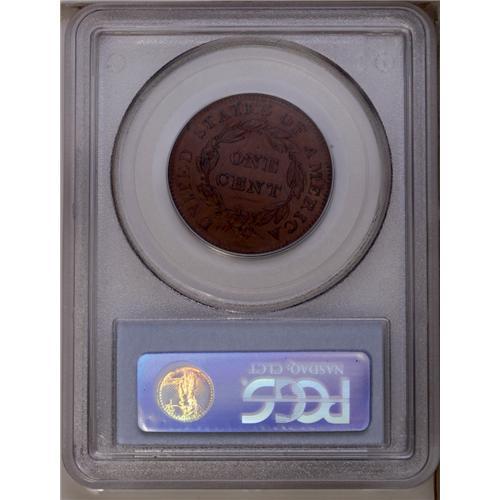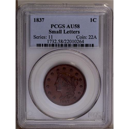 1837 1C Plain Cords, Medium Letters AU58 PCGS. N-4, R.