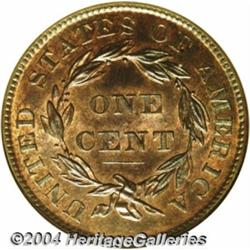 <B>1837<1C> Plain Cords, Medium Letters MS66 Red and Brown NGC.</B></I> N-6, R.2. This is a wonderful cent with considerable original orange mint color intermingled with blue and lilac toning. A few tiny imperfections are visible near the date. Otherwise, both the obverse and the reverse have virtually perfect surfaces. <BR><BR><B>Important notice:</B> Heritage usually auctions material at the rate of 200-250 lots per hour. On some occasions eBay Live bid software or the Internet may not be able to keep up with the pace of the auction. We recommend placing a realistic absentee bid now as insurance to avoid disappointment. Occasionally the auctioneer may eliminate or reject an eBay Live bid, and the auctioneer may also reopen a lot after the close of the eBay live bidding (usually because we missed an audience bid), and may reject your bid even if it shows you as the winning bidder. By bidding via eBay Live, you agree that Heritage may award the lot to another bidder at its sole discretion under the circumstances described above or any other reasonable circumstances. Since eBay bids are not shown to us until we open the lot on the floor, we treat those bids just like floor bids. In most cases the floor responds before the eBay bid is presented to us, due to Internet lag time, so for consistency we have made it a policy that floor bids are always considered first over tie eBay live bids. Also please note that all Heritage lots purchased through eBay Live carry a 20% Buyer's Premium. Please make sure you read the Terms and Conditions before you bid. </span></font></tr></table></td></tr></table>