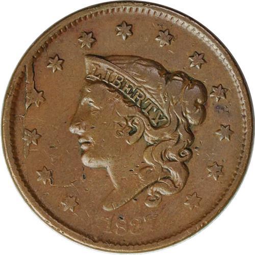 <B>1837<1C> Plain Cords, Medium Letters. N-2, R.2. XF45 NGC. Fine 12 EAC.</B></I> Vertical Crack Stars 3 and 4; Weak Legend, No Reverse Cracks. An outstanding, later die state within this remarkable progression. The area between both sets of parallel cracks has started to raise into retained cuds. Abraded tan surfaces; once cleaned and recolored, and now with hints of pinkish color on both sides. Envelope Included.
