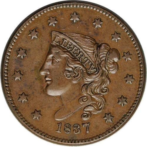 <B>1837<1C> Plain Cords, Medium Letters. N-8, 7, R.1. MS62 Brown NGC. XF45 EAC.</B></I> The varieties cataloged by both Frank Andrews and Howard Newcomb as their numbers 7 and 8 are now known to be from the same dies. Early states, such as the example in this lot, are the coins that were described as N-8, while later die states are typically described as N-7. See John Wright's reference for a discussion of the early and late die states. This example meets all of the qualifications for the early die state, including die engraving points and scratches over MER, at the leaf tip below ST, up from the right top of N in CENT, and elsewhere. The dentilation is bold on both sides. A die crack through TATES OF is present in all die states. Intermingled chestnut and steel-brown with traces of lighter tan color.<BR><I>Ex: Kress (10/14/1970).</B></I> Envelope Included.
