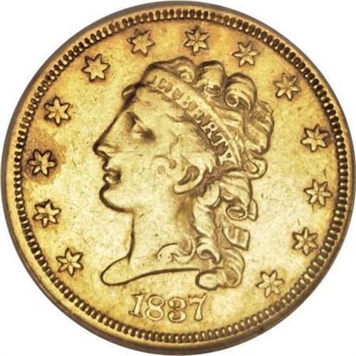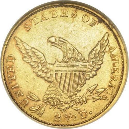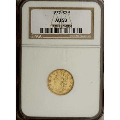 <B>1837 $2 1/2 AU53 NGC.</B></I> McCloskey-B R.2. A nice AU example of this available variety, characterized by three stripes in each horizontal shield line and the lowest arrowhead joined to the last A in AMERICA. with some luster still remaining on the apricot-gold surfaces that cede to deeper orange-gold near the rims on each side. The other varieties for the year are much scarcer.<BR><BR><B>Coin Engraver:</B> William Kneass<BR><BR><b>Shipping:</b> Coins & Currency (<a target="_blank" href="http://www.heritageauctions.com/common/shipping.php">view shipping information</a>)