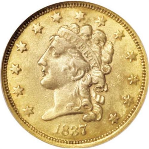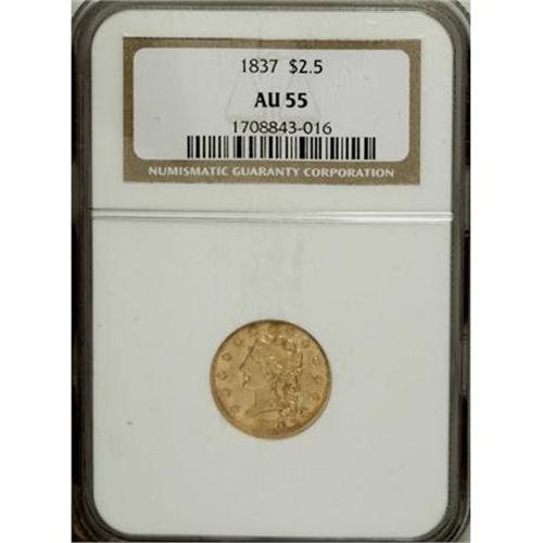 <B>1837 $2 1/2 AU55 NGC.</B></I> McCloskey-B, R.2. This lightly circulated straw-gold quarter eagle has plentiful luster for the grade, and the surfaces are smooth save for a few minor marks on the left obverse field. The upper reverse field is minutely granular. The 1837 is a better date with less than one-tenth the mintage of its 1836 predecessor.<BR><BR><B>Coin Engraver:</B> William Kneass<BR><BR><b>Shipping:</b> Coins & Currency (<a target="_blank" href="http://www.heritageauctions.com/common/shipping.php">view shipping information</a>)