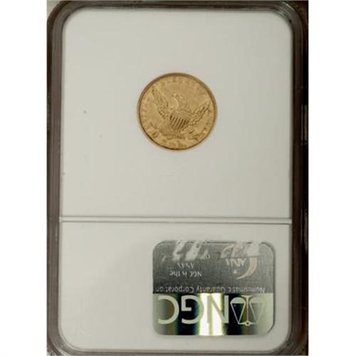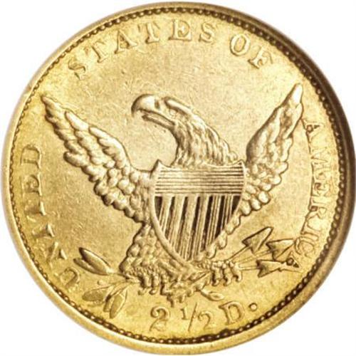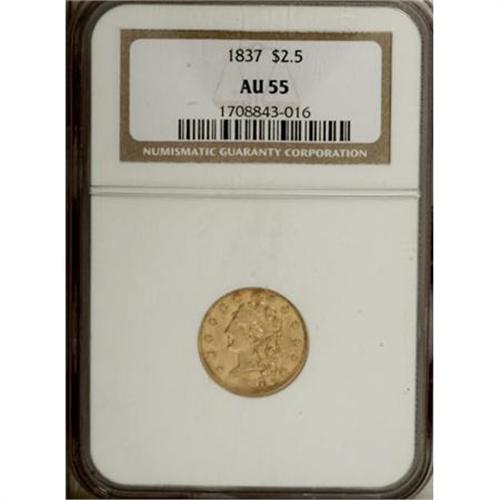 <B>1837 $2 1/2 AU55 NGC.</B></I> McCloskey-B, R.2. This lightly circulated straw-gold quarter eagle has plentiful luster for the grade, and the surfaces are smooth save for a few minor marks in the left obverse field. The upper reverse field is finely granular. The 1837 is a better date with less than one-tenth the mintage of its 1836 predecessor.<BR><BR><B>Coin Engraver:</B> William Kneass<BR><BR><b>Shipping:</b> Coins & Currency (<a target="_blank" href="http://www.heritageauctions.com/common/shipping.php">view shipping information</a>)