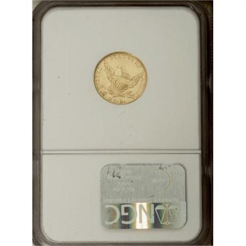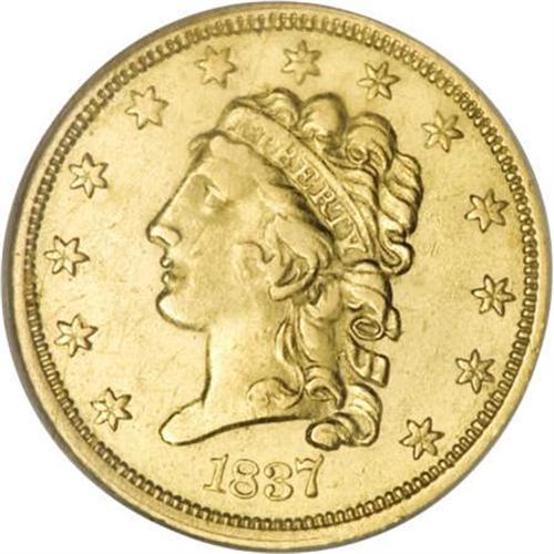 <B>1837 $2 1/2 AU55 NGC.</B></I> McCloskey-B, R.2. Luster glimmers from the stars, legends, eagle, and portrait of this pale gold representative. Surprisingly unabraded save for a solitary thin mark on the upper reverse field. The 1837 is a better date since the mintage is less than one-tenth of the 1836 production peak of the short-lived series.<BR><BR><B>Coin Engraver:</B> William Kneass<BR><BR><b>Shipping:</b> Coins & Currency (<a target="_blank" href="http://www.heritageauctions.com/common/shipping.php">view shipping information</a>)