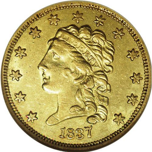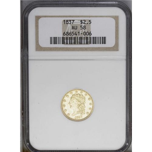 <B>1837<$2 1/2> AU58 NGC.</B></I> McCloskey-B, R.3. Plenty of luster remains on the minimally worn, lightly abraded surfaces of this near-Mint example. Only the obverse stars, the hair detail above Liberty's ear, and parts of the eagle's shield are less than boldly struck. Just 45,080 pieces were struck of this scarcer issue.