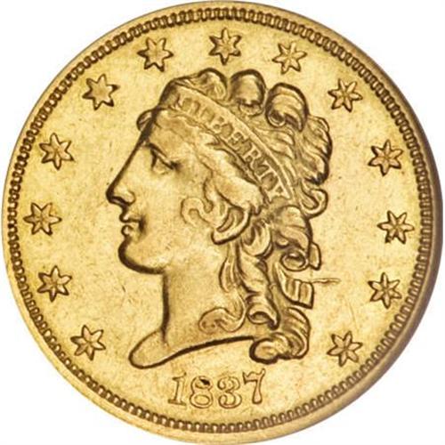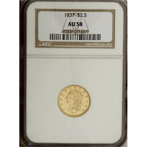 <B>1837 $2 1/2 AU58 NGC.</B></I> McCloskey-B, R.2. The most available die pairing for the 1837. Among Philadelphia Mint quarter eagles of this design, only the 1839 issue is scarcer. The present example reveals bright yellow-gold surfaces and luster in the recessed areas. The design elements are generally well brought up, save for some of the star centers and hair at Liberty's brow. A few minute marks are scattered about, none individually serious. <BR><BR><B>Coin Engraver:</B> William Kneass<BR><BR><b>Shipping:</b> Coins & Currency (<a target="_blank" href="http://www.heritageauctions.com/common/shipping.php">view shipping information</a>)