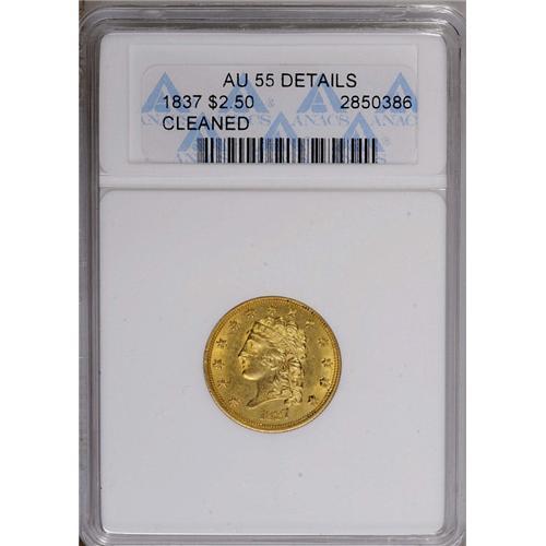 <B>1837<$2 1/2>--Cleaned--ANACS. AU55 Details.</B></I> McCloskey-B, R.3. The reverse field exhibits vertical hairlines, but luster dominates the borders. A trace of wear is noted on the highpoints of the curls, and a thin horizontal mark crosses the cheekbone.