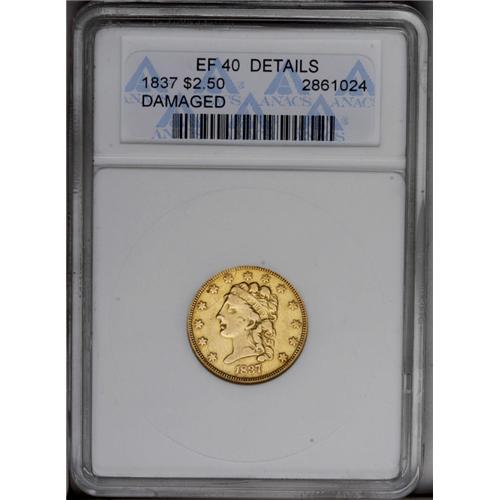 <B>1837<$2 1/2>--Damaged--ANACS. XF40 Details.</B></I> McCloskey-B, R.3. The usual dies for this lower mintage date. This piece is subdued and minutely granular from a past cleaning, and the obverse rim has a moderately abraded appearance near 12 o'clock. A pinscratch on the neck is barely worthy of mention.