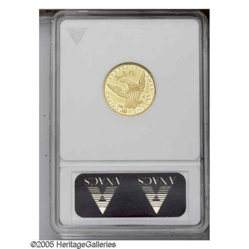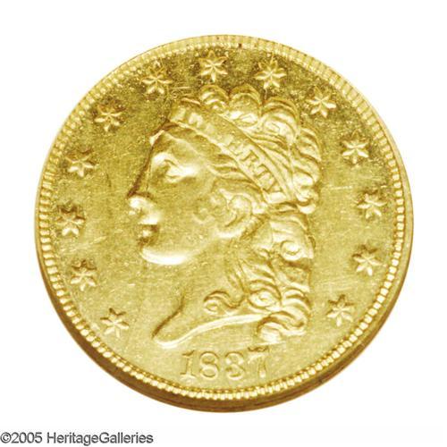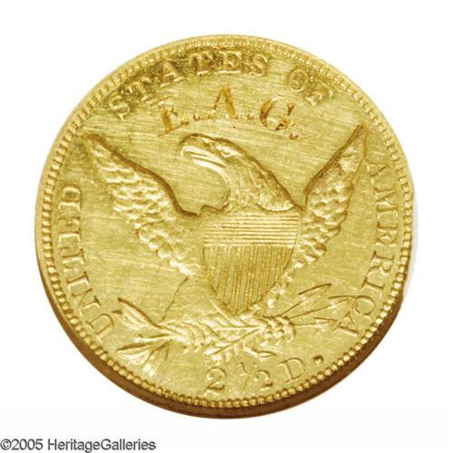 <B>1837<$2 1/2>--Graffiti, Cleaned--ANACS. AU50 Details.</B></I> McCloskey-A, R.8. An extremely rare variety with two line vertical stripes in the shield. The 7 in the date is recut, and the A in STATES is high. <B>Possibly a Proof-Only Variety.</B></I> The other possibility is that this is the only known non-Proof example of this die marriage. A couple of prominent die cracks bisect the obverse. Considerable proof or prooflike luster, but hairlined, and the initials E.A.G. are nicely engraved above the eagle. A bit softly struck in the centers, as are the other known examples. <B>This is only the third example of the die marriage that we have seen or heard of.</B></I> One example of the variety is currently in the Smithsonian Institution holdings, and another, a Gem Proof, was sold in May 2000 as part of the Harry Bass Collection. That coin had one of the two die cracks, through star 8 and down to TY and the digit 7. However, the other crack apparent on the present coin, through star 6 and across the face to the chin and the lower border just below star 1, was not present on the Bass coin. The reverse has a faint crack through A of STATES, also not present on the Bass coin. If we are correct in our analysis, this is an incredibly important opportunity for those collectors of Classic Head Quarter Eagle varieties, representing only the third known example. A recent phone call from John McCloskey, who is currently preparing a manuscript on the Classic Head Quarter Eagles, confirms our analysis.<BR><I>Ex: H. Field (12/1961) $30.</B></I><BR><I>From The John H. Schroeder Collection.</B></I>