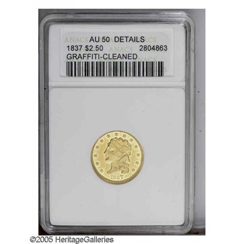 1837 $2 1/2 --Graffiti, Cleaned--ANACS. AU50 Details. M 1837[$2 1/2]--Graffiti, Cleaned--ANACS. AU50