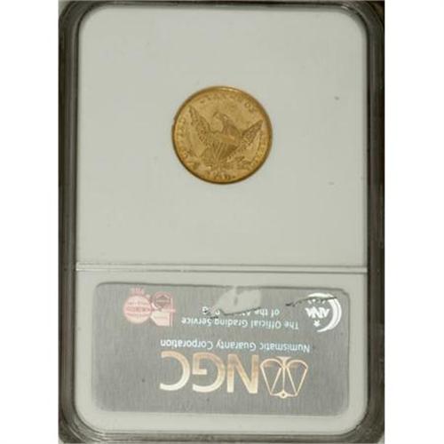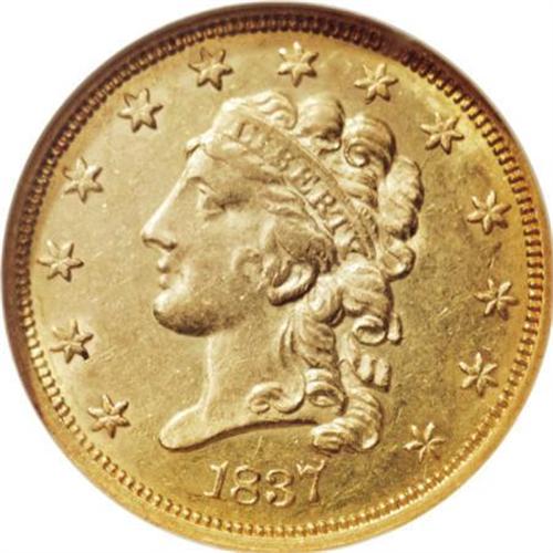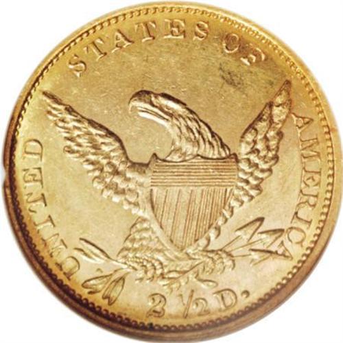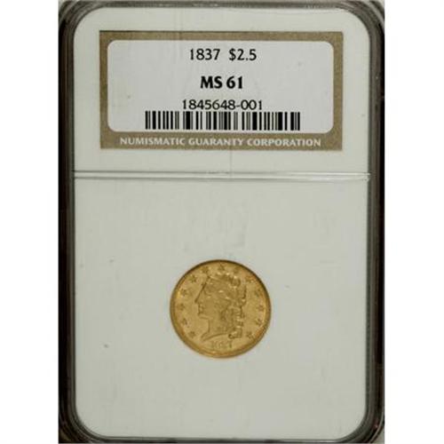 <B>1837 $2 1/2 MS61 NGC.</B></I> McCloskey-B, R.2, the usual dies for this low mintage issue. Peripheral elements are precisely struck, although the vertical shield lines and the curl above the ear show blending of detail, customary for the type. The open fields are impressively unabraded, as is the portrait. Census: 13 in 61, 22 finer (10/07).<BR><BR><B>Coin Engraver:</B> William Kneass<BR><BR><b>Shipping:</b> Coins & Currency (<a target="_blank" href="http://www.heritageauctions.com/common/shipping.php">view shipping information</a>)