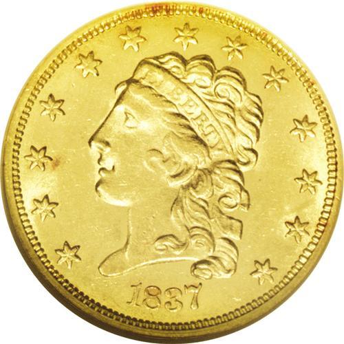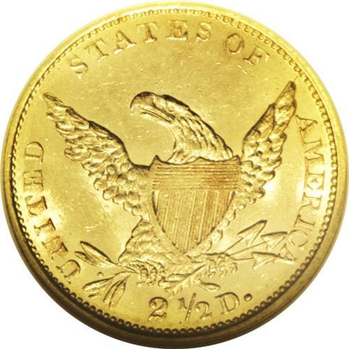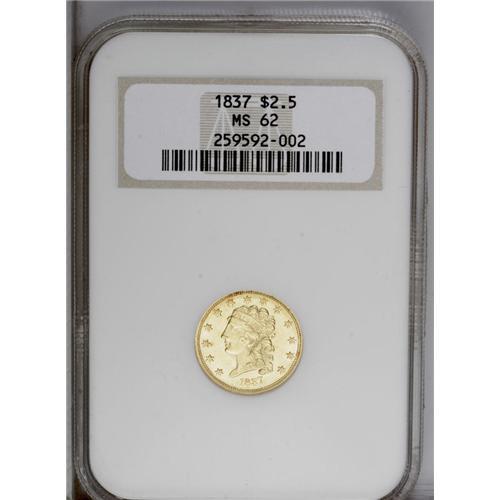 <B>1837<$2 1/2> MS62 NGC.</B></I> McCloskey-B, R.3. The left shield border is wide and there are three lines in each vertical shield stripe. An arrowhead touches the right foot of the final A in AMERICA. This beautiful example boasts highly reflective, semiprooflike fields with canary-yellow surfaces and a tinge of copper-gold. Nicely struck, save for the center highpoints, and pleasing overall. The reverse die is rotated clockwise about 20 degrees.<BR><I>From The Derrick Snider Collection.</B></I>