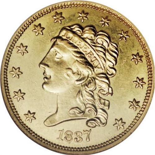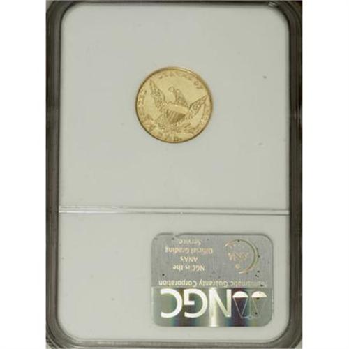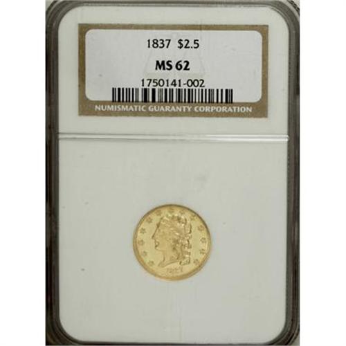 <B>1837 $2 1/2 MS62 NGC.</B></I> McCloskey-B, R.2. Intricately struck except for the usual merging of detail on the curls near Liberty's face. Marks are virtually absent aside from a couple of hair-thin lines beneath the beak. A faint die crack nearly bisects the obverse between 1:30 and 6 o'clock. Census: 18 in 62, 4 finer (10/07).<BR><BR><BR><B>Coin Engraver:</B> William Kneass<BR><BR><b>Shipping:</b> Coins & Currency (<a target="_blank" href="http://www.heritageauctions.com/common/shipping.php">view shipping information</a>)