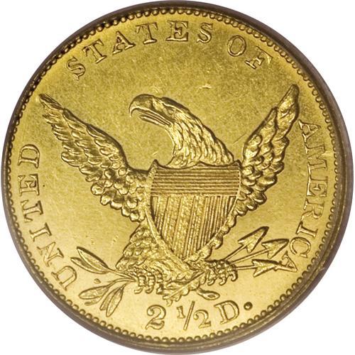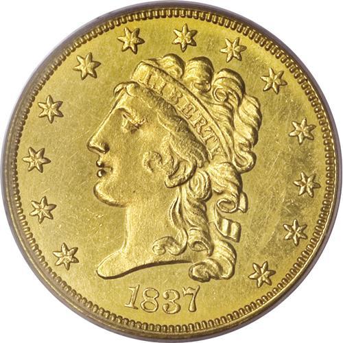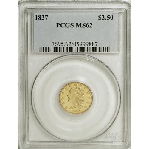 <B>1837 $2 1/2 MS62 PCGS.</B></I> McCloskey-B, R.3. The attribution is confirmed by three lines in each shield stripe, and the last A in AMERICA joined to an arrowhead. The 1837 quarter eagle, with a mintage of 45,080 pieces, is usually seen in XF and AU. Uncirculated examples are rare, and tend to be located in the low end of the Mint State continuum. Indeed, PCGS and NGC have seen a total of about 60 Uncirculated examples, the vast majority of which grade from MS60 to MS62. Fully struck coins are rare, with most showing weakness on the central highpoints.<BR> The MS62 piece in this lot displays bright yellow-gold surfaces with just the slightest tint of light green. The motifs are lightly frosted, and highlighted by the partially prooflike fields. A good strike is seen on the design elements, as manifested in the strong definition on Liberty's hair, the star centers, and the eagle's plumage, though minor softness is noted in the hair over Liberty's ear. A few unobtrusive, wispy handling marks prevent an even higher grade.<BR><BR><b>Shipping:</b> Coins & Currency (<a target="_blank" href="http://www.heritageauctions.com/common/shipping.php">view shipping information</a>)