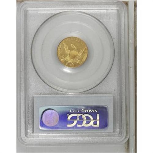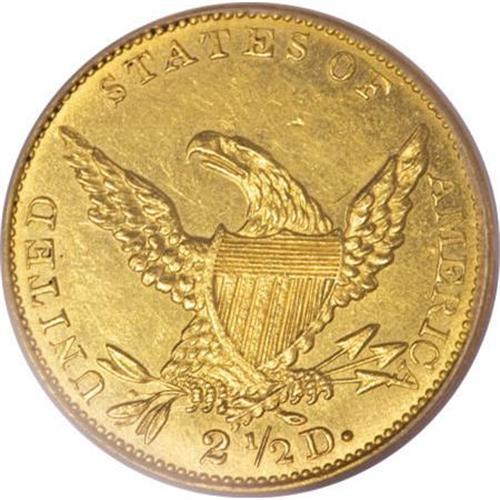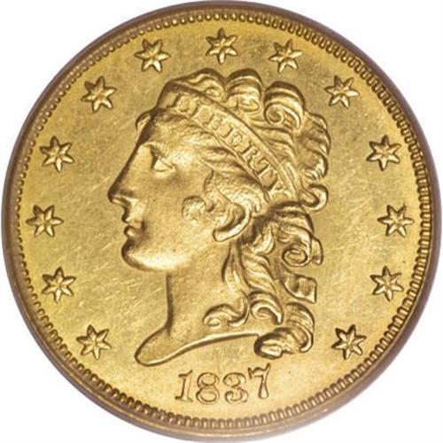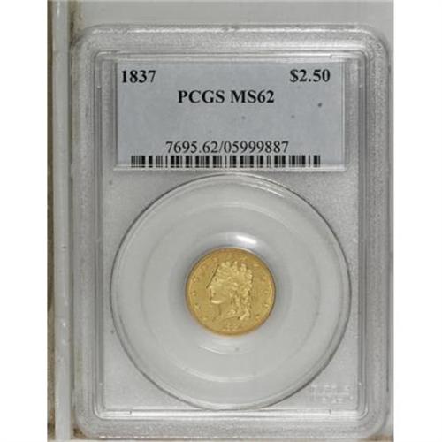 <B>1837 $2 1/2 MS62 PCGS.</B></I> McCloskey-B, R.3. The attribution is confirmed by three lines in each shield stripe, and the last A in AMERICA joined to an arrowhead. The 1837 quarter eagle, with a mintage of 45,080 pieces, is usually seen in XF and AU. Mint State examples are rare, and tend to occur in low-end Mint State grades. To date, PCGS and NGC have seen about 60 Uncirculated examples, the vast majority of which grade from MS60 to MS62. Fully struck coins are rare, with most showing weakness on the central highpoints. This MS62 example displays bright yellow-gold surfaces that have retained most of their luster. The design elements are sharply impressed, save for minor weakness in the hair at Liberty's ear. Light handling marks are visible on each side.<BR><BR><B>Coin Engraver:</B> William Kneass<BR><BR><b>Shipping:</b> Coins & Currency (<a target="_blank" href="http://www.heritageauctions.com/common/shipping.php">view shipping information</a>\)