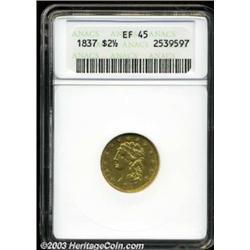 <TABLE cellSpacing=0 cellPadding=0 width="100%" bgColor=#000000 border=0><TBODY><TR><TD width="100%"><TABLE cellSpacing=1 cellPadding=3 width="100%" border=0><TBODY><TR><TD width="100%" bgColor=#79735c><FONT face=arial color=#ffffff size=3><B>Description</B> </FONT></TD></TR><TR><TD width="100%" bgColor=#ffffff><FONT face=arial size=2><B>1837 $2 1/2 XF45 ANACS.</B></I> McCloskey-B, R.3. Traces of luster cling to protected areas, and the greenish-gold surfaces offer no noteworthy abrasions. Liberty's forehead has moderate wear, and the vertical shield stripes have minor softness of strike.<BR><I>From The Dr. Douglas Roane Collection.</B></I> </FONT></TD></TR></TBODY></TABLE></TD></TR></TBODY></TABLE><BR><A name=PricesRealized></A><TABLE cellSpacing=0 cellPadding=0 width="100%" bgColor=#000000 border=0><TBODY><TR><TD width="100%"><TABLE cellSpacing=1 cellPadding=3 width="100%" border=0><TBODY><TR><TD width="100%" bgColor=#79735c><A name=PR><FONT face=arial color=#ffffff size=3><B>Previous Prices from Heritage Auctions</B> </FONT></A></TD></TR><TR><TD bgColor=#f6f6ed><TABLE cellSpacing=0 cellPadding=0 width="100%" border=1><TBODY><TR><TD align=middle width="33%"><B>Date</B></TD><TD align=middle width="33%"><B>Service</B></TD><TD align=middle width="33%"><B>Price</B></TD></TR><TR bgColor=whitesmoke><TD width="33%"><B>01/11/2003</B></TD><TD width="33%">ANACS</TD><TD width="33%">$402.50</TD></TR></TBODY></TABLE></TD></TR><TR><TD bgColor=#ffffff><FONT face=arial size=1 ?>PLEASE NOTE: All prices realized reflect the final hammer price PLUS the buyer's premium in auctions that charge a buyer's premium. Each item has a notation at the top of the listing indicating whether that lot included a buyer's premium. Example: A item that sells with a final hammer price of $100 and a 20% buyer's premium will display with a price realized of $120. All information listed is intended to be as accurate as possible, but errors are possible. Please use this guide carefully and inform us of any inaccuracies. </FONT></TD></TR></TBODY></TABLE></TD></TR></TBODY></TABLE><BR><TABLE cellSpacing=0 cellPadding=0 width="100%" bgColor=#000000 border=0><TBODY><TR><TD width="100%"><TABLE cellSpacing=1 cellPadding=3 width="100%" border=0><TBODY><TR><TD width="100%" bgColor=#79735c colSpan=6><FONT face=arial color=#ffffff size=3><B>Price Guide*</B> </FONT></TD></TR><TR bgColor=#f6f6ed><TD align=middle><B>Grade</B> </TD><TD align=middle><B>Coin World<BR>(Trends)</B> </TD><TD align=middle><B>Numismedia<BR>Retail</B> </TD><TD align=middle><B>Numismedia<BR>Wholesale</B> </TD><TD align=middle><B>Coin<BR>Universe</B> </TD><TD align=middle><B>Heritage<BR>Value Index</B> </TD></TR><TR bgColor=#ffffff><TD align=middle>40</TD><TD align=right>$475.00</TD><TD align=right>$550.00</TD><TD align=right>$440.00</TD><TD align=right>$460.00</TD><TD align=right>$345.67</TD></TR><TR style="FONT-WEIGHT: bold" bgColor=#cccfdd><TD align=middle>45</TD><TD align=right>$575.00</TD><TD align=right>---</TD><TD align=right>---</TD><TD align=right>---</TD><TD align=right>$443.15</TD></TR><TR bgColor=#ffffff><TD align=middle>50</TD><TD align=right>$725.00</TD><TD align=right>$910.00</TD><TD align=right>$725.00</TD><TD align=right>---</TD><TD align=right>$605.79</TD></TR><TR bgColor=#ffffff><TD colSpan=6><FONT size=1>*All information listed is intended to be as accurate as possible, but errors are possible. No item may be returned or refused based on this information which is provided as a service to our customers. You should contact each pricing source directly to determine the accuracy of this information. </FONT></TD></TR></TBODY></TABLE></TD></TR></TBODY></TABLE><BR><TABLE cellSpacing=0 cellPadding=0 width="100%" bgColor=#000000 border=0><TBODY><TR><TD width="100%"><TABLE cellSpacing=1 cellPadding=3 width="100%" border=0><TBODY><TR><TD width="100%" bgColor=#79735c><FONT face=arial color=#ffffff size=3><B>Population Guide</B> </FONT></TD></TR><TR bgColor=#ffffff><TD align=middle><!-- Begin Output of Population Grid--><TABLE cellSpacing=0 cellPadding=0 width="100%" border=0><TBODY><TR><TD vAlign=center><TABLE cellSpacing=0 width="100%" border=1 cellsadding="3"><TBODY><TR><TD vAlign=center><TABLE cellSpacing=0 cellPadding=3 width="100%" border=1><TBODY><TR><TD vAlign=center align=middle bgColor=#f0f1e8 colSpan=2 <CENTER><FONT face=Arial size=2><B>PCGS Pop </B></FONT><CENTER></CENTER></TD><TD vAlign=center align=middle bgColor=#f0f1e8 colSpan=2><CENTER><FONT face=Arial size=2><B>NGC Pop</B></CENTER></FONT></TD></TR><TR><TD vAlign=center><FONT face=Arial size=2>(45)</FONT> </TD><TD vAlign=center align=right><FONT face=Arial size=2>12</FONT> </TD><TD vAlign=center><FONT face=Arial size=2>(45)</FONT> </TD><TD vAlign=center align=right><FONT face=Arial size=2>17</FONT> </TD></TR><TR><TD vAlign=center><FONT face=Arial size=2>(>45)</FONT> </TD><TD vAlign=center align=right><FONT face=Arial size=2>55</FONT> </TD><TD vAlign=center><FONT face=Arial size=2>(>45)</FONT> </TD><TD vAlign=center align=right><FONT face=Arial size=2>98</FONT> </TD></TR></TBODY></TABLE></TD></TR></TBODY></TABLE></TD></TR></TBODY></TABLE><!-- End Output of Population Grid--> Important notice: Heritage usually auctions material at the rate of 200-250 lots per hour. On some occasions eBay Live bid software or the Internet may not be able to keep up with the pace of the auction. We recommend placing a realistic absentee bid now as insurance to avoid disappointment. Occasionally the auctioneer may eliminate or reject an eBay Live bid, and the auctioneer may also reopen a lot after the close of the eBay live bidding (usually because we missed an audience bid), and may reject your bid even if it shows you as the winning bidder. By bidding via eBay Live, you agree that Heritage may award the lot to another bidder at its sole discretion under the circumstances described above or any other reasonable circumstances. Also please note that all Heritage lots purchased through eBay Live carry a 20% Buyer's P