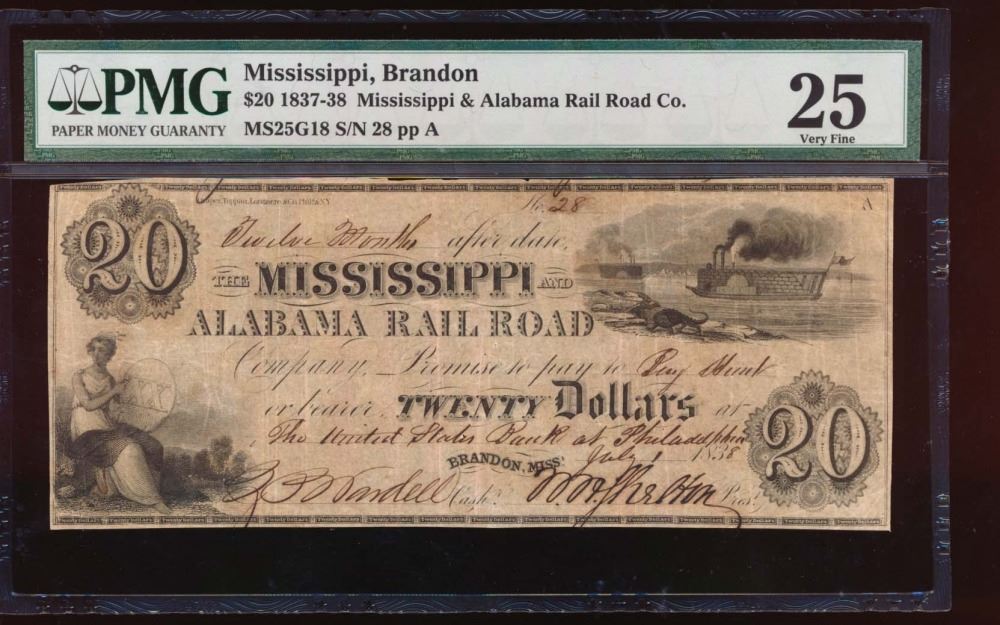 One 1837 $20 Mississippi and Alabama Obsolete Note PMG 25.