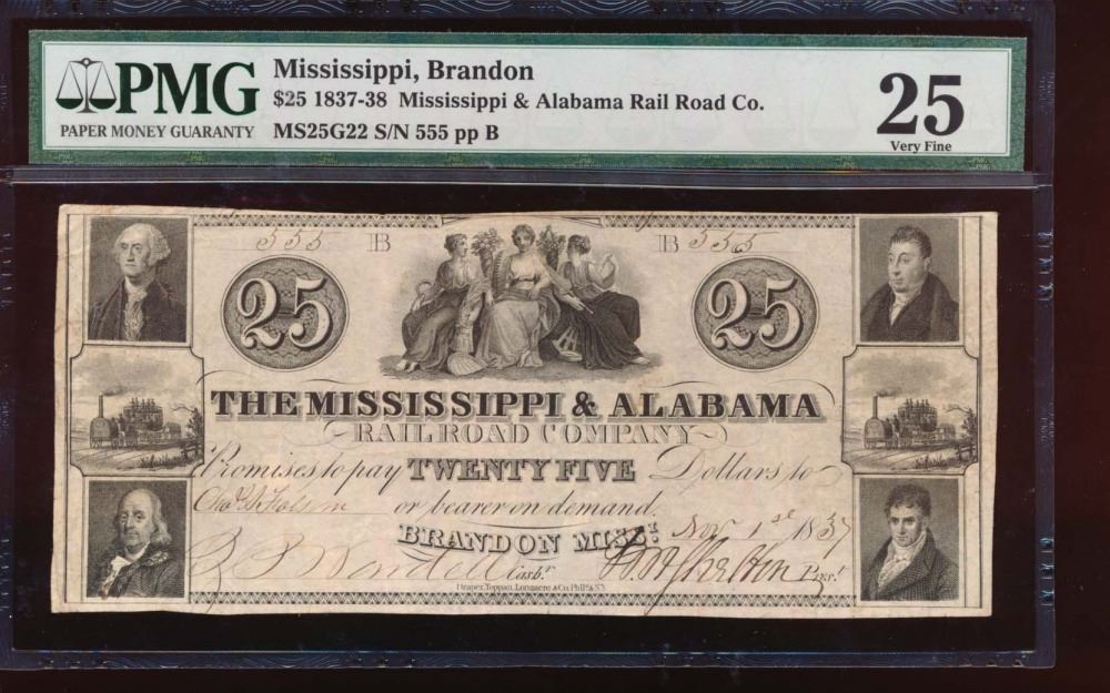 One 1837 $25 Mississippi and Alabama Obsolete Note PMG 25.