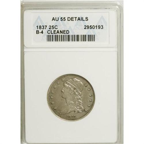 <B>1837 25C --Cleaned--ANACS. AU55 Details.</B></I> <B>B-4, R.3.</B></I> NGC Census: (11/104). PCGS Population (14/89). Mintage: 252,400. Numismedia Wsl. Price for NGC/PCGS coin in AU55: $580. (#5356)<BR><BR><B>Coin Engraver:</B> William Kneass<BR><BR><b>Shipping:</b> Coins & Currency (<a target="_blank" href="http://www.heritageauctions.com/common/shipping.php">view shipping information</a>\)
