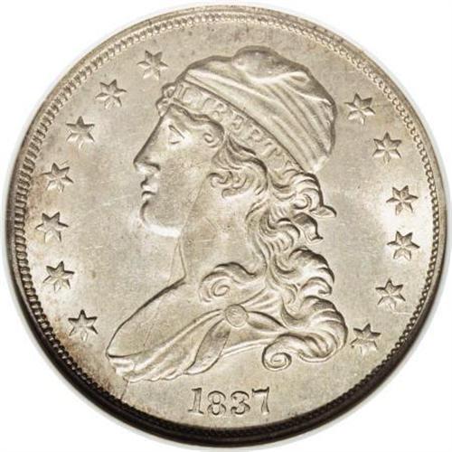 <B>1837 25C MS63 NGC.</B></I> B-4, R.3. The late die state with the bisecting obverse die crack from 1 o'clock to 7:30. The reverse has an arc-shaped die crack through most of STATES. This is a crisply struck and lustrous quarter with pastel silver-blue and straw-gold toning. The surfaces are surprisingly devoid of contact.<BR><BR><B>Coin Engraver:</B> William Kneass<BR><BR><b>Shipping:</b> Coins & Currency (<a target="_blank" href="http://www.heritageauctions.com/common/shipping.php">view shipping information</a>)