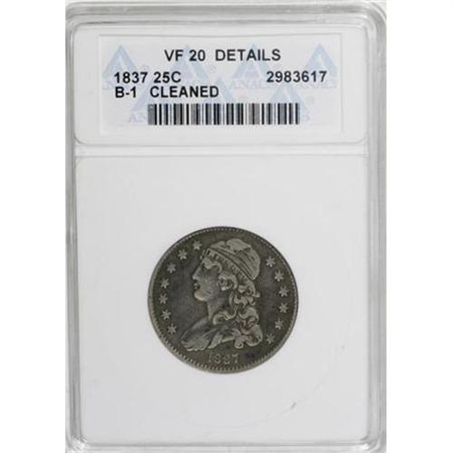 <B>1837 25C --Cleaned--ANACS. VF20 Details.</B></I> B-1. NGC Census: (0/170). PCGS Population (1/159). Mintage: 252,400. Numismedia Wsl. Price for NGC/PCGS coin in VF20: $104. (#5356)<BR><BR><B>Coin Engraver:</B> William Kneass<BR><BR><b>Shipping:</b> Coins & Currency (<a target="_blank" href="http://www.heritageauctions.com/common/shipping.php">view shipping information</a>\)