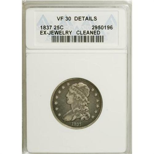 <B>1837 25C --Cleaned, Ex-Jewelry--ANACS. VF30 Details.</B></I> <B>B-5, R.5.</B></I> NGC Census: (4/165). PCGS Population (5/153). Mintage: 252,400. Numismedia Wsl. Price for NGC/PCGS coin in VF30: $169. (#5356)<BR><BR><B>Coin Engraver:</B> William Kneass<BR><BR><b>Shipping:</b> Coins & Currency (<a target="_blank" href="http://www.heritageauctions.com/common/shipping.php">view shipping information</a>\)