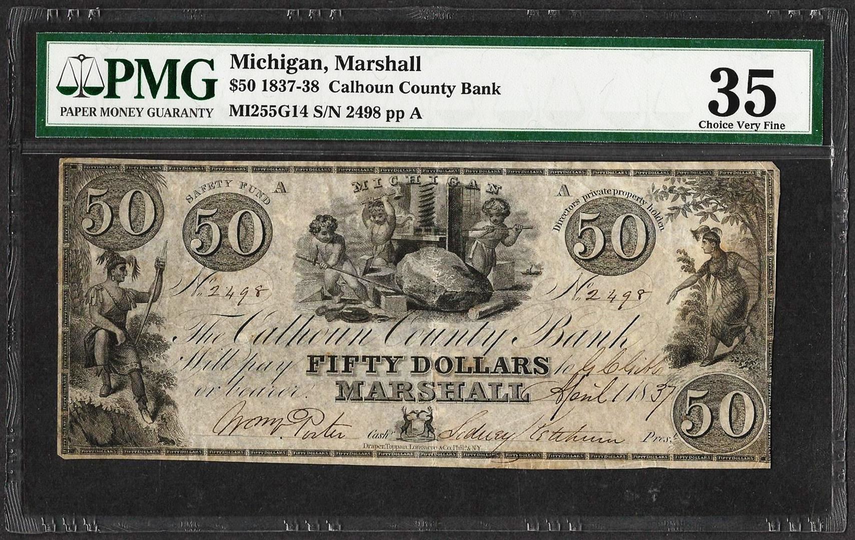 One 1837-38 $50 Calhoun County Bank Marshall, MI Obsolete Note PMG Choice Very Fine 35. PMG Certified.