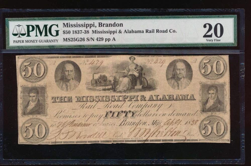 One 1837-38 $50 Mississippi & Alabama Rail Road Co Note PMG 20.