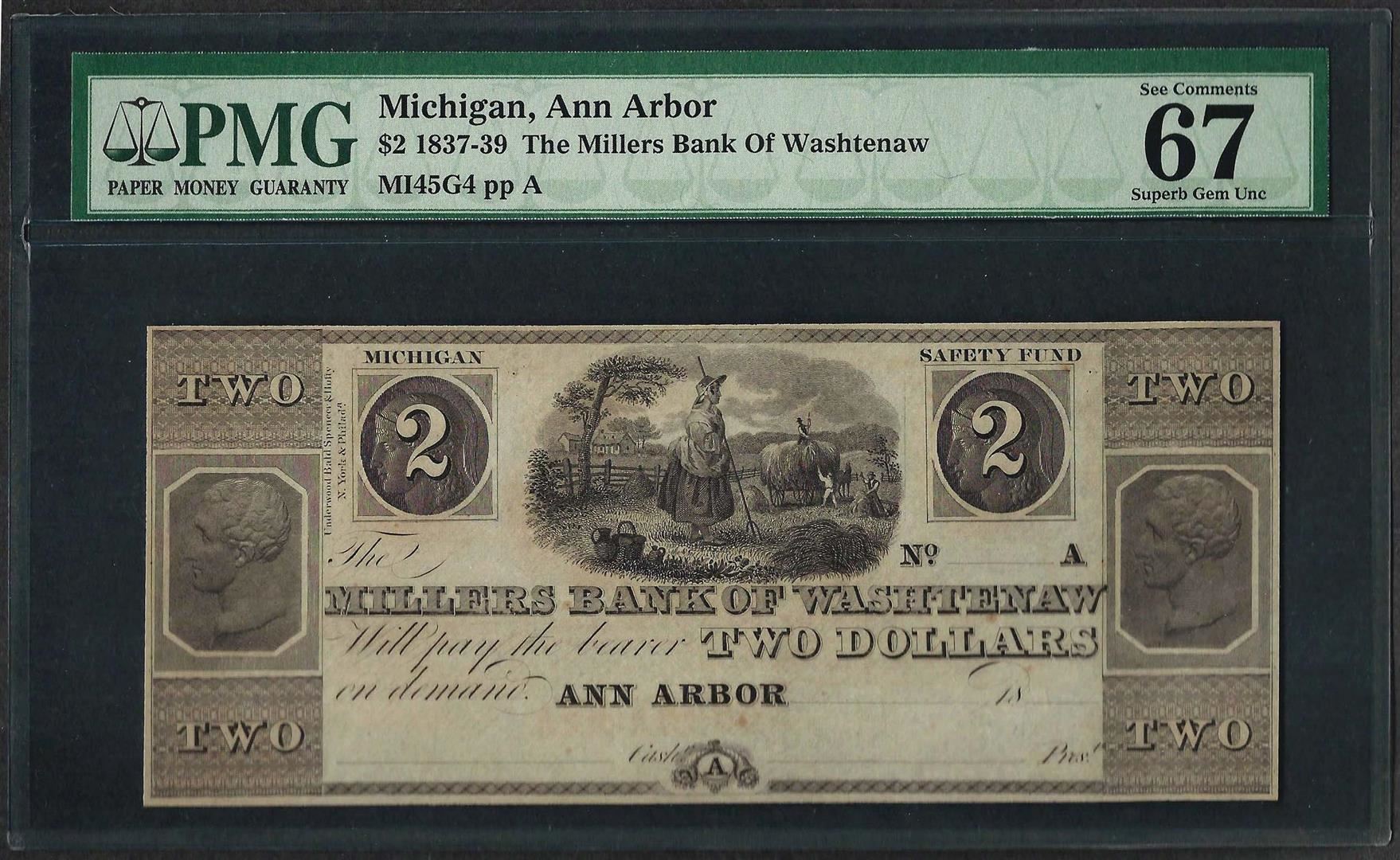 One 1837-39 $2 Millers Bank of Washtenaw Obsolete Note PMG Superb Gem Uncirculated 67EPQ. PMG Certified.