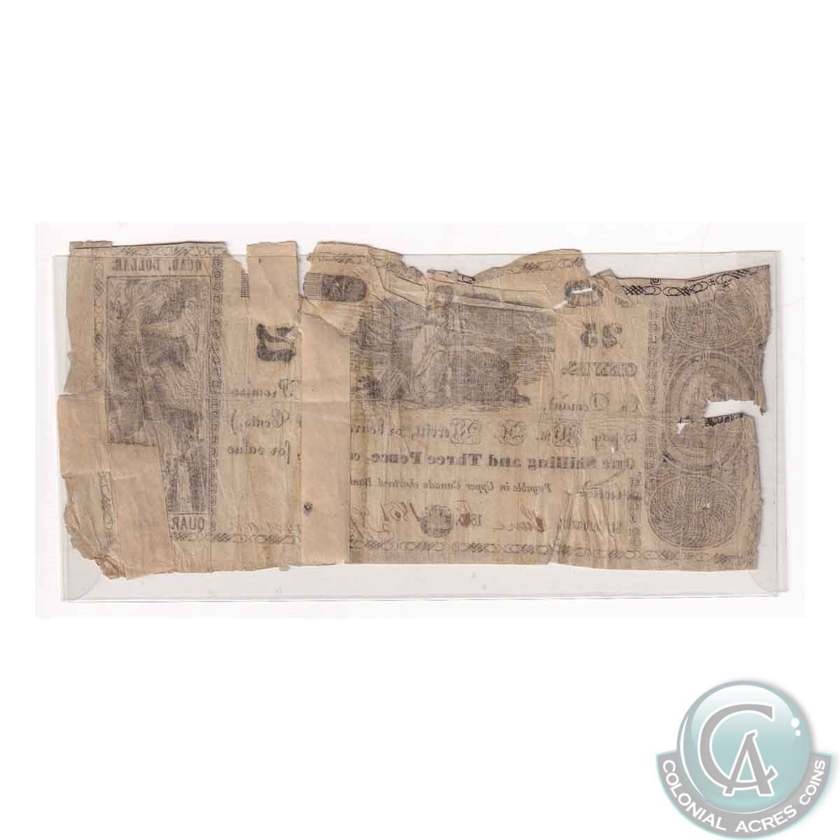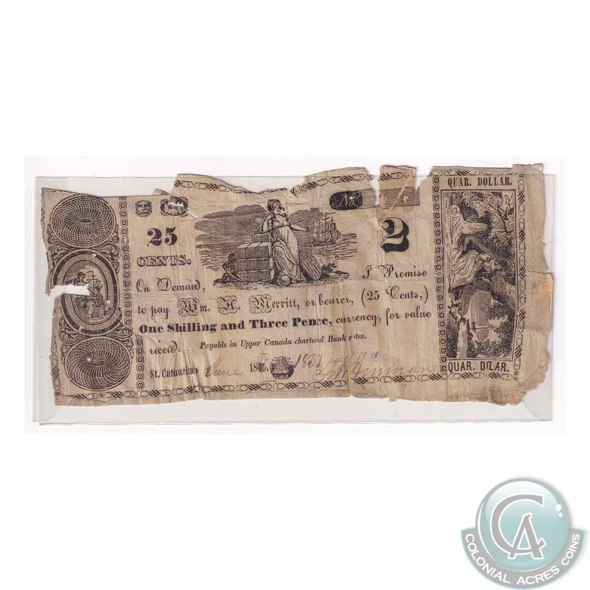 The intact pieces of the piece are fairly nice considering the time period; a solid VF. However, the piece has many tears and tape repairs. It has listed William Hamilton Merritt as the Payee; a prominent business man in the area at the time. However, is it also payable to the bearer as is typical for merchant script. This is perhaps the first time such as piece has been made available for sale and it may be some time before another one surfaces. A prime opportunity to own a previously unknown piece.