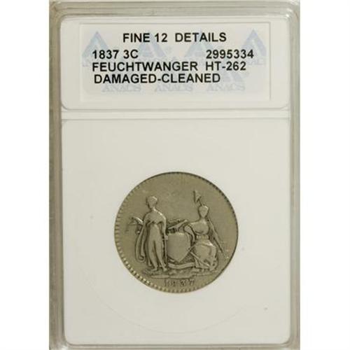 <B>1837 3C Feuchtwanger Three Cent--Damaged, Cleaned--ANACS. Fine 12 Details.</B></I> HT-262. NGC Census: (0/0). PCGS Population (0/33). (#20002)<BR><BR><b>Shipping:</b> Coins & Currency (<a target="_blank" href="http://www.heritageauctions.com/common/shipping.php">view shipping information</a>)