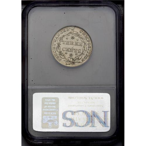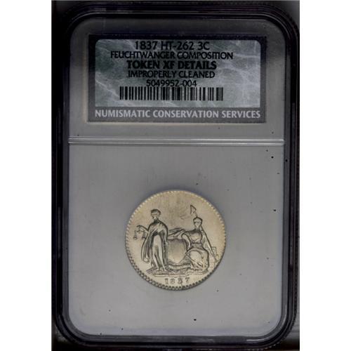 <B>1837<3C> Feuchtwanger Three Cent--Improperly Cleaned--NCS. XF Details.</B></I> Low-117, HT-262, R.3. Subdued and unnaturally smooth from a rather harsh cleaning. Vertical planchet crack, as often seen. While Feuchtwanger did issue Three Cent varieties with an obverse eagle (one being included in this sale), reminiscent of his One Cent design, the present variety depicts the New York arms, similar to the rare 1787 Excelsior Copper. Peach and olive tints overlay the gunmetal-gray surfaces. Listed on page 373 of the 2006 <I>Guide Book.</B></I><BR><I>From The Steve Glenn Collection.</B></I> <BR><BR><B>Important notice:</B> Heritage usually auctions material at the rate of 200-250 lots per hour. On some occasions eBay Live bid software or the Internet may not be able to keep up with the pace of the auction. We recommend placing a realistic absentee bid now as insurance to avoid disappointment. Occasionally the auctioneer may eliminate or reject an eBay Live bid, and the auctioneer may also reopen a lot after the close of the eBay live bidding (usually because we missed an audience bid), and may reject your bid even if it shows you as the winning bidder. By bidding via eBay Live, you agree that Heritage may award the lot to another bidder at its sole discretion under the circumstances described above or any other reasonable circumstances. Since eBay bids are not shown to us until we open the lot on the floor, we treat those bids just like floor bids. In most cases the floor responds before the eBay bid is presented to us, due to Internet lag time, so for consistency we have made it a policy that floor bids are always considered first over tie eBay live bids. Also please note that all Heritage lots purchased through eBay Live carry a 20% Buyer's Premium. Please make sure you read the Terms and Conditions before you bid. This lot is being auctioned in conjunction with a live floor auction by Heritage Galleries & Auctioneers. All final auction and invoice information will be supplied by Heritage Galleries & Auctioneers, and all other information should be considered preliminary. Lot:5393 <BR><BR><B>Winning Notification and Billing:</B> After the FINAL session in this auction is complete, Heritage will send e-mail and snail mail invoices. This process normally takes several days. All final auction and invoice information will be supplied by Heritage Galleries & Auctioneers, and all other information should be considered preliminary. <BR><BR>This auction will be conducted on a live auction floor and over the Internet through eBay Live. If you choose to place an absentee bid, please take a moment to <font color='#0000ff'><u><a href='http://pages.ebay.com/liveauctions/help/before/laabsentee.html'>learn how eBay Live absentee bidding works</a></u></font><font color='#000000'>