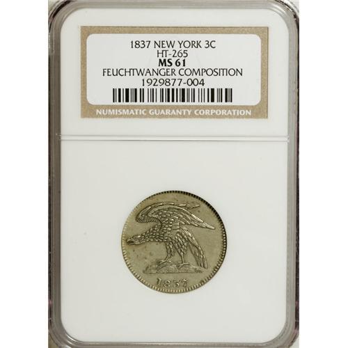 <B>1837 3C Feuchtwanger Three Cent MS61 NGC.</B></I> Low-119, HT-265, R.7. Dr. Feuchtwanger's German-silver 1837 cents are common, but this is not the case for his three cent varieties. HT-262, which emulates the New York state coat of arms, is scarce. The eagle three cent dies, HT-263 and HT-265 are even more difficult to locate, particularly HT-265, which curiously presents the denomination as "3 THREE CENTS." This ungainly designation may account for its rarity. This sharply struck and satiny piece has cream-gray fields and some russet-gray toning in protected areas. A few nearly imperceptible hairlines determine the grade.<BR><I>Ex: Virgil Brand; Donald Miller; Rossa & Tannenbaum; John J. Ford, Jr. Collection, Part IV (Stack's, 6/04), lot 216.</B></I><BR><BR><b>Shipping:</b> Coins & Currency (<a target="_blank" href="http://www.heritageauctions.com/common/shipping.php">view shipping information</a>)