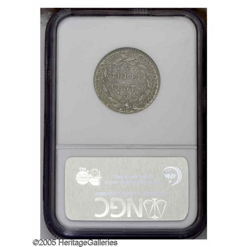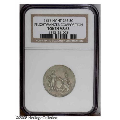 <B>1837<3C> Feuchtwanger Three Cent MS63 NGC.</B></I> Low-117, HT-262, R.3. While Feuchtwanger's One Cent German-silver tokens (which contained no silver) are relatively plentiful, his Three Cent tokens are undeniably scarce, particularly in Mint State. While Feuchtwanger did issue Three Cent varieties with an obverse eagle, reminiscent of his One Cent design, the present variety depicts the New York arms, similar to the rare 1787 Excelsior Copper. Peach and olive tints overlay the gunmetal-gray surfaces. An unmarked and sharply struck piece with subtle satin luster. Listed on page 373 of the 2006 <I>Guide Book.</B></I>