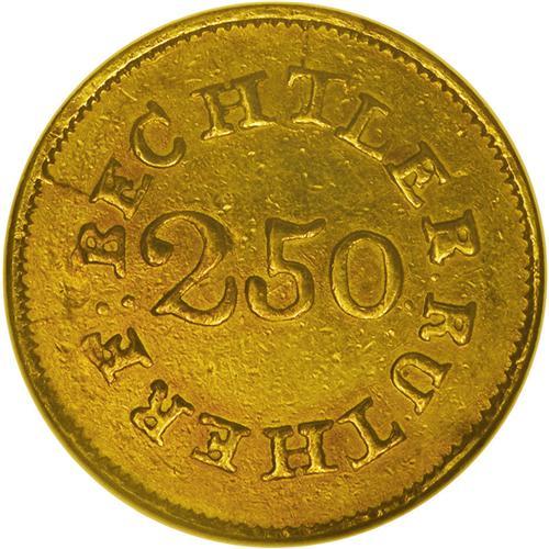 <B>(1837-42)<$2 1/2> C.Bechtler Quarter Eagle, 67G. 21C.--Whizzed--ANACS. AU Details, Net XF40.</B></I> K-10, R.5. This rare Bechtler quarter eagle is evenly struck and retains glimmers of its original luster. Examination beneath a loupe reveals bright, glossy, and minutely pebbled surfaces. A minor rim ding is noted at 4:30 on the reverse (denomination) side.<BR><I>From The Carolina Gold Collection, Part Four.</B></I>