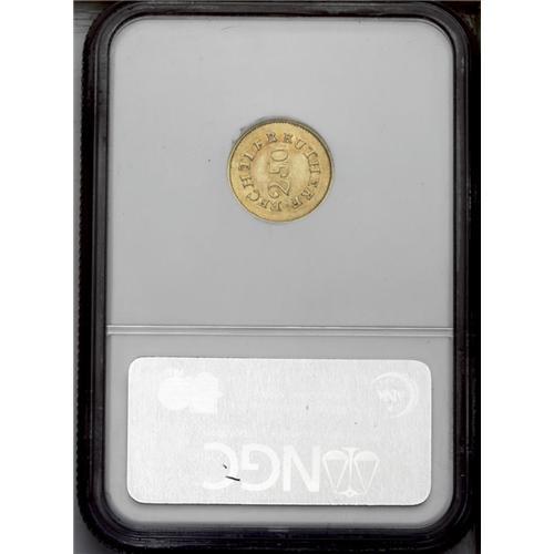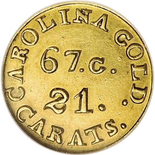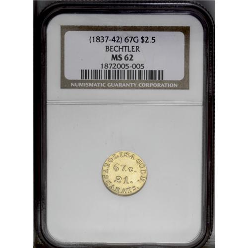 <B>(1837-42) $2 1/2 C. Bechtler Quarter Eagle, 67G. 21C. MS62 NGC.</B></I> K-10, R.5. Similar to the Kagin-9 variety, but with 67.G./21 in the center, and a period after CARATS. This rare Bechtler piece shows a somewhat dished appearance, with slight bulging that shows toward the center of the reverse (denomination) side. That side is rotated about 90 degrees counterclockwise from its expected location. This piece has considerable luster remaining on the green-gold surfaces, with tinges of copper color on the reverse. Only a few light scrapes and abrasions are noted, consistent with the MS62 grade. This piece is tied with a half-dozen or so other pieces at both services for the finest certified of this elusive issue. Listed on page 345 of the 2007 <I>Guide Book.</B></I><BR><I>From The Stone 1837 Collection.</B></I><BR><BR><b>Shipping:</b> Coin/Currency (<a target="_blank" href="http://www.heritageauctions.com/common/shipping.php">view shipping information</a>)