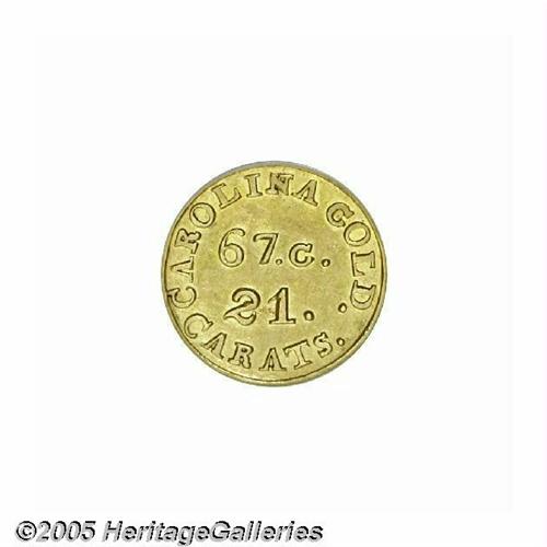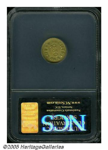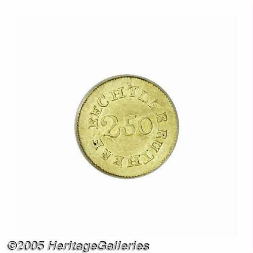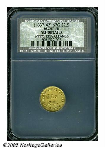 <B>(1837-42)<$2 1/2> C.Bechtler Quarter Eagle, 67G. 21C. AU Details, Improperly Cleaned, NCS.</B></I> K-10. Breen-7753. It has been over 6 1/2 years since we last offered an example of this rare Quarter Eagle Territorial from Christopher Bechtler. The K-10 is the only Quarter Eagle of this weight and fineness, being also identifiable by the use of inverted Vs as As on the legends. Like most seen, this example is struck from dies rotated approximately 90 degrees and has a pair of reverse die cracks jetting out from the borders. The green-gold surfaces are dulled by an old cleaning and display a small, shallow dig beneath the 2 in the denomination. Listed on Page 293 of the 2005 <I>Guide Book.</B></I>