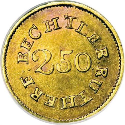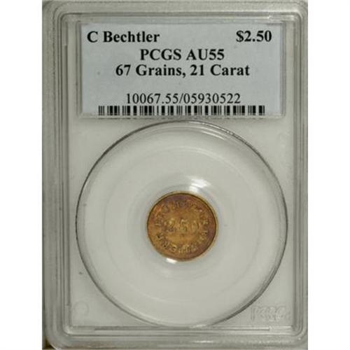 <B>(1837-42) $2 1/2 C. Bechtler Quarter Eagle, 67G. 21C. AU55 PCGS.</B></I> K-10, R.5. Part of the fifth series of Bechtler coinage that was struck early in the 1837 to 1842 era. Donald Kagin distributes the various Christopher Bechtler gold issues among seven different series. The first through third series were coined from 1831 to 1834, the fourth series from 1834 to 1837, and the fifth through seventh series from 1837 to 1842. After these seven series, the firm was operated by Augustus Bechtler from 1842 until the early 1850s, in essence an eighth series. Although lightly hairlined, the surfaces are exceptional with rich lilac toning over deep gold color. Listed on page 349 of the 2008 <I>Guide Book</B></I>.<BR><BR><b>Shipping:</b> Coins & Currency (<a target="_blank" href="http://www.heritageauctions.com/common/shipping.php">view shipping information</a>)