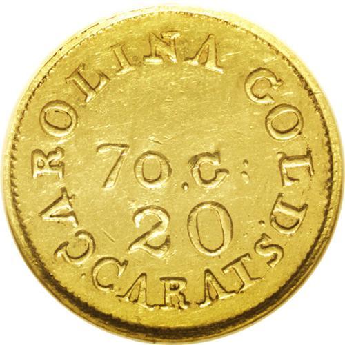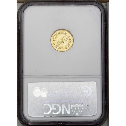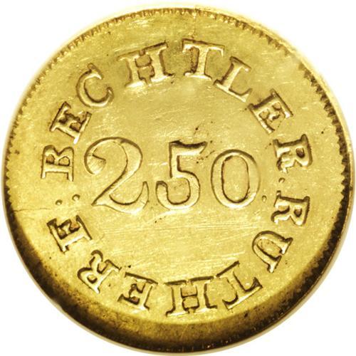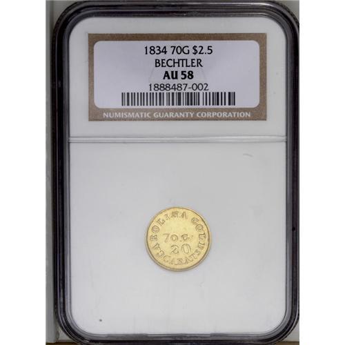 <B>(1837-42)<$2 1/2> C.Bechtler Quarter Eagle, 70G. 20C. AU58 NGC.</B></I> K-13, R.6. Plain Edge. This particular issue was struck using South Carolina gold. Interestingly, the engraver used an inverted V for the letter A on the reverse die. The Bechtlers' coinage earned great respect during this period as the coins were of the true weight and fineness stated, and the gold value was actually worth slightly more than face value. The Bechtlers also coined the first gold dollars in the United States, and the Philadelphia Mint followed with their own gold dollars some 18 years later. Remarkably, the Bechtler coining press still survives in the American Numismatic Society's Museum. NGC has graded two examples this high with three coins seen finer (the finest MS62). The coin is sharply and evenly struck throughout, and the green-gold surfaces are lightly abraded with the only notable distractions being a series of shallow pinscratches below 250 on the reverse.