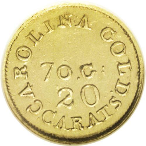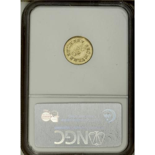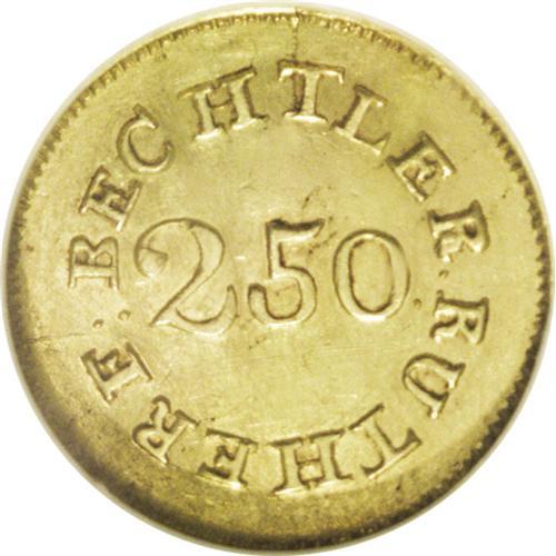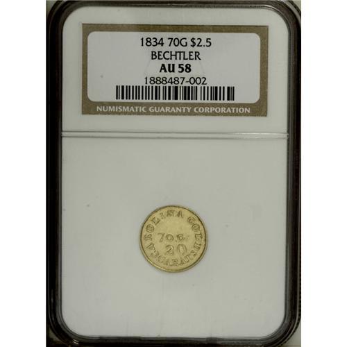 <B>(1837-42) $2 1/2 C. Bechtler Quarter Eagle, 70G. 20C. AU58 NGC.</B></I> K-13, R.6. Plain Edge. This rare issue was struck using South Carolina gold. Interestingly, the engraver used an inverted V for the letter A on the reverse die. The Bechtlers' coinage earned great respect during this period as the coins were of the true weight and fineness stated, and the gold value was actually worth slightly more than face value. The Bechtlers also coined the first gold dollars in the United States, and the Philadelphia Mint followed with their own gold dollars some 18 years later. Remarkably, the Bechtler coining press still survives in the American Numismatic Society's Museum. NGC has graded two examples this high with three coins seen finer (the finest MS62). The coin is sharply and evenly struck throughout, and the green-gold surfaces are lightly abraded with the only notable distractions being a series of faint pinscratches below 250 on the reverse. Listed on page 345 of the 2007 <I>Guide Book.</B></I><BR><BR><b>Shipping:</b> Coin/Currency (<a target="_blank" href="http://www.heritageauctions.com/common/shipping.php">view shipping information</a>)