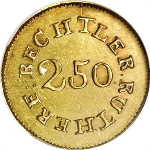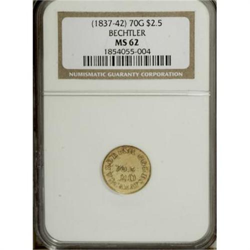 <B>(1837-42) $2 1/2 C. Bechtler Quarter Eagle, 70G. 20C. MS62 NGC.</B></I> K-13, R.6. The four letter As on the obverse are all inverted Vs, without crossbars. From the seventh series of Bechtler coinage. Struck in gold from South Carolina, with a plain edge. This piece is sharply defined, with the reverse die rotated counterclockwise by approximately 150 degrees. The surfaces are faintly prooflike and exhibit green-gold toning. This piece is tied with five others as one of the finest known examples of K-13 (two are from PCGS). Listed on page 349 of the 2008 <I>Guide Book</B></I>. NGC Census: 4 in 62, 0 finer at either service (6/07). <BR><I>From The Stephen L. Schechter Collection of Bechtler Territorial Gold.</B></I><BR><BR><b>Shipping:</b> Coins & Currency (<a target="_blank" href="http://www.heritageauctions.com/common/shipping.php">view shipping information</a>)