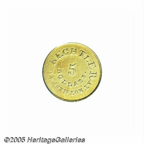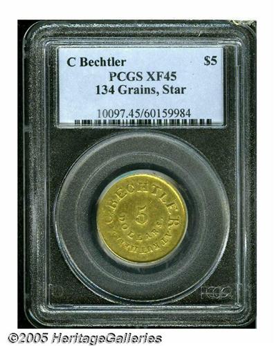 <B>(1837-42)<$5> C.Bechtler Five Dollar, 134G, With Star XF45 PCGS.</B></I> K-20, R.4. Lemon-gold color dominates, with traces of golden-brown toning before DOLLARS and in other selected areas. Ample luster glints from the legends. A couple of moderate marks near the central 5 are of little relevance. Some softness of detail along the left side, perhaps the planchet was thin in this area prior to the strike. Struck from widely rotated dies. Listed on page 293 of the 2005 <I>Guide Book.</B></I><BR><I>From The Great Western Collection of Territorial Gold.</B></I>