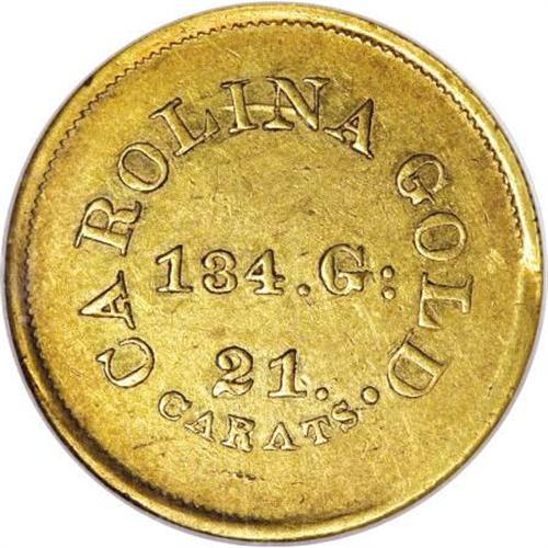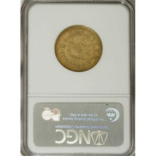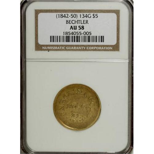 <B>(1842-52) $5 A. Bechtler Five Dollar, 134G. 21C. AU58 NGC.</B></I> K-27, Low R.5. Luster brightens the legends of this difficult variety, the only 134 G. August Bechtler issue. The fields are lightly abraded, but the dusky lime-gold toning is attractive. The obverse rim is flat between 3 and 5 o'clock, as made but from an unknown cause. Listed on page 350 of the 2008 <I>Guide Book</B></I>.<BR><I>From The Stephen L. Schechter Collection of Bechtler Territorial Gold.</B></I><BR><BR><b>Shipping:</b> Coins & Currency (<a target="_blank" href="http://www.heritageauctions.com/common/shipping.php">view shipping information</a>)