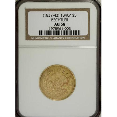 <B>(1837-42) $5 C. Bechtler Five Dollar, 134G, With Star AU58 NGC.</B></I> K-20, R.4. Donald Kagin's variety 20 is the single most plentiful Christopher Bechtler five dollar piece produced from 1831 to 1842, an excellent opportunity for the casual collector to obtain an example of this historically important Territorial gold coinage. The variety is attributed to the sixth coinage series of Bechtler gold pieces and was probably coined circa 1839 or 1840. This light yellow gold specimen has splashes of orange toning around the devices, providing excellent eye appeal. The strike is bold, despite the fairly primitive die engraving. Listed on page 350 of the 2008 <I>Guide Book</B></I>.<BR><BR><b>Shipping:</b> Coins & Currency (<a target="_blank" href="http://www.heritageauctions.com/common/shipping.php">view shipping information</a>)